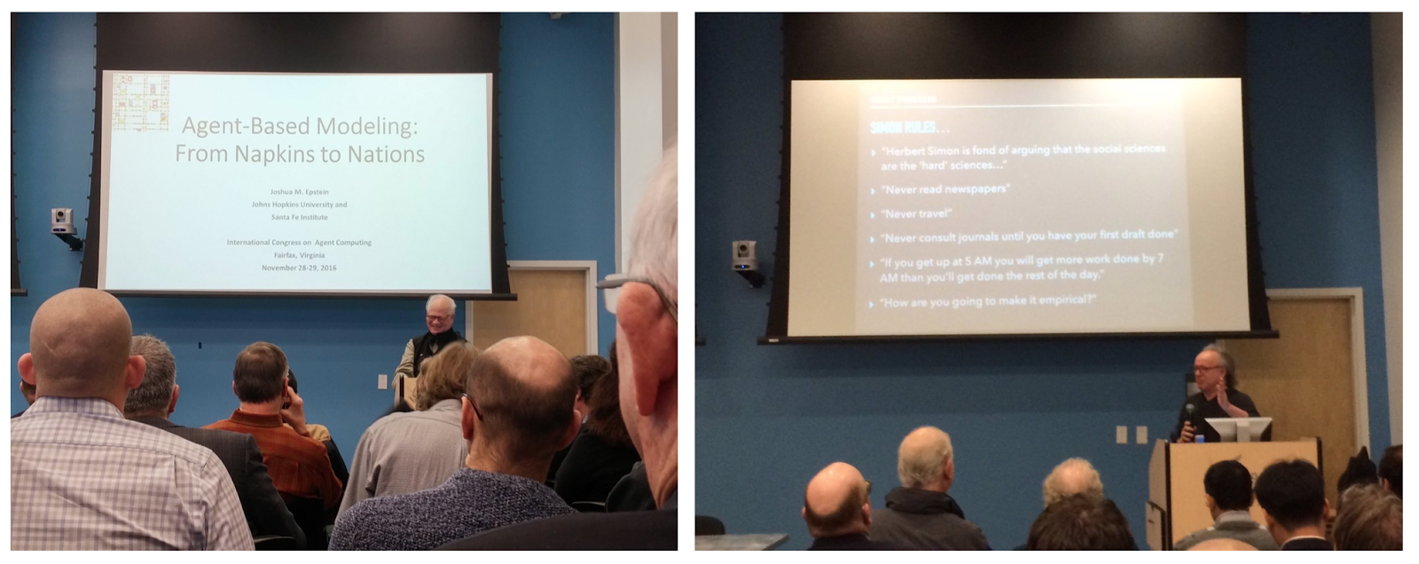 Josh and Rob each gave really impressive talks entitled “Agent-based modeling: From Napkins to Nations” and “The Adoption of Agent Computing over Time by Social Scientists as Compared to Game Theory and Experimental/ Behavioral Economics” respectively. Which reflected how agent computing has evolved over the last 20 years with plenty of funny anecdotes along the way including references and critiques of their works such as “masculine gods of their cyberspace creations” and where the field is going.