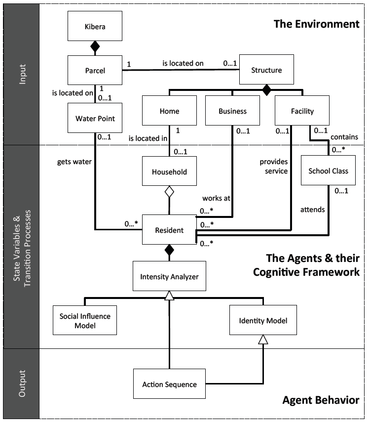 The movie below shows the agent-based model which explores ethnic clashes in the Kenyan slum. The environment is made up of households, businesses, and service facilities (such data comes from OpenStreetMap). Agents within the model use a transportation network to move across the environment. As agents go about their daily activities, they interact with other agents – building out an evolving social network. Agents seek to meet their identity standard. Failure to reach their identity standard increases the agents frustration which can lead to an aggressive response (i.e. moving from blue to red color) such as rioting.